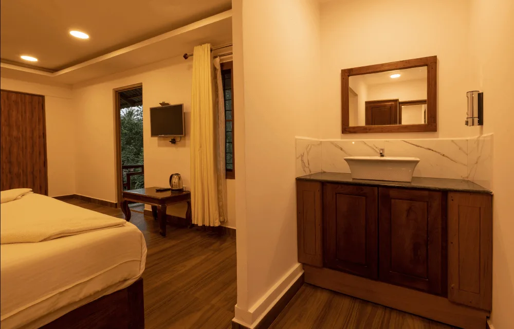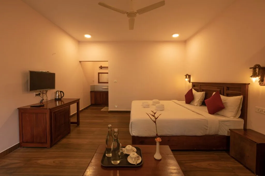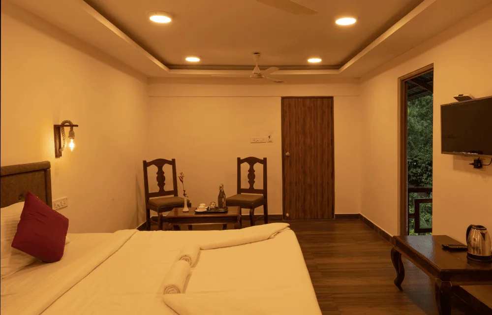 Deluxe (Non-AC) rooms are large rooms with 1 king size bed, a study table with chairs and a flat screen television and a sit out.